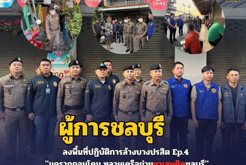 พล.ต.ต.ธวัชเกียรติ จินดาควรสนอง ผบก.ภ.จว.ชลบุรี และ พ.ต.อ.ชาตรี สุขศิริ รอง ผบก.ภ.จว.ชลบุรี นำกำลังเจ้าหน้าที่กว่า 600 นาย จากหลายหน่วยงาน ปิดล้อมตรวจค้น 116 จุดทั่วจังหวัด ในปฏิบัติการ “ล้างบางปรสิต Ep.4 ขุดรากถอนโคน ทลายเครือข่ายยาเสพติด”
